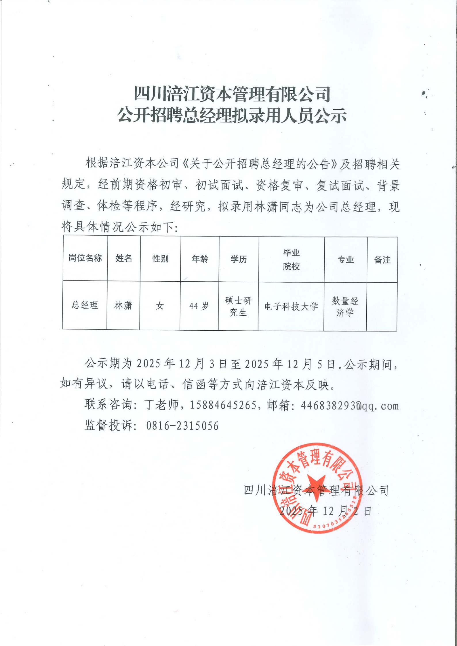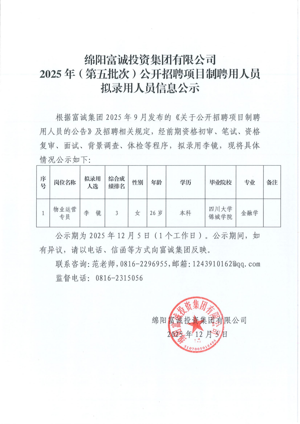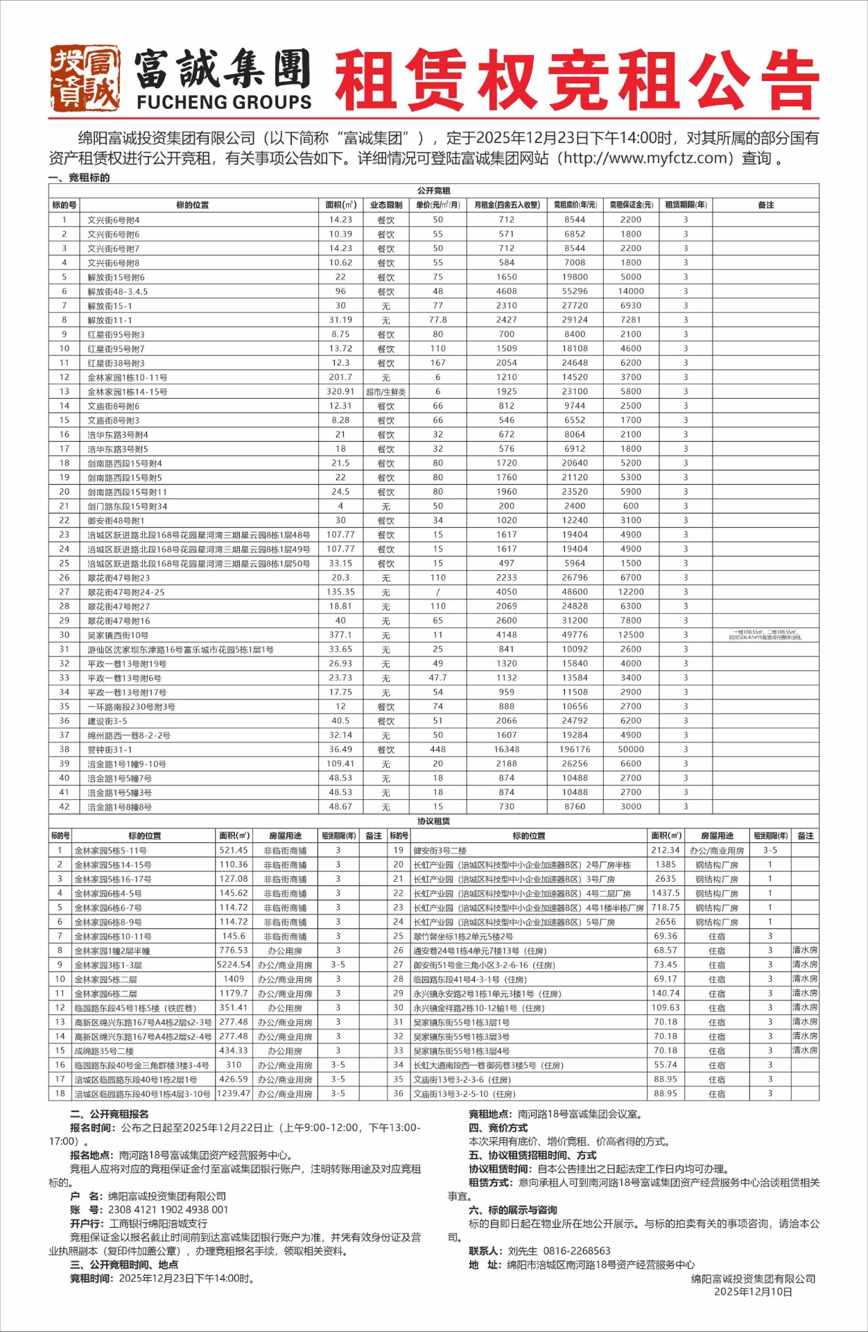 公 告 绵阳富城建筑工程有限公司本次需通过竞争性谈判公开招募绵中路道路安全隐患整改项目招标代理单位,此次报价采用下浮率报价方式进行。报名时请提交以下材料:1、申请人有企业营业执照(相关经营范围),副本(三证合一)复印件加盖鲜章,能提供增值税专用发票。2、法定代表人身份证:法定代表人亲自到场的出示身份证原件,存复印件。若法定代表人不能亲自到场的,被委托人应出具法定代表人授权委托书原件和被委托人的身份证(查验原件,存加盖鲜章复印件),同时被委托人员须出具本单位社保证明。报名时间:2025年12月5日至2025年12月9日上午09…… [更多]