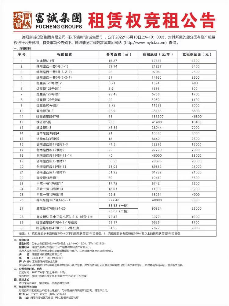 公 告 绵阳富城建筑工程有限公司本次需通过竞争性谈判公开招募中国(绵阳)科技城循环经济产业园厂房及配套基础设施建设项目(二期)测绘单位,此次报价采用竞争性谈判一次性报价方式进行。报名时请提交以下材料:1、提供营业执照复印件(三证合一,加盖鲜章),能提供增值税专用发票。2、法定代表人身份证:法定代表人亲自到场的出示身份证原件,存复印件。若法定代表人不能亲自到场的,被委托人应出具法定代表人授权委托书原件和被委托人的身份证及法定代表人授权书(身份证查验原件,存加盖鲜章复印件;法定代表人授权委托书详见附件)。3、竞标人应当具有相关测…… [更多]